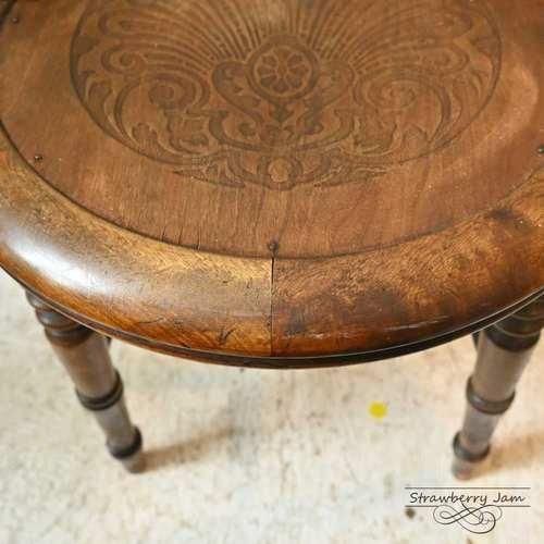 美しい模様がデザインされた丸い座面が目を惹くクラシカルな存在感です。